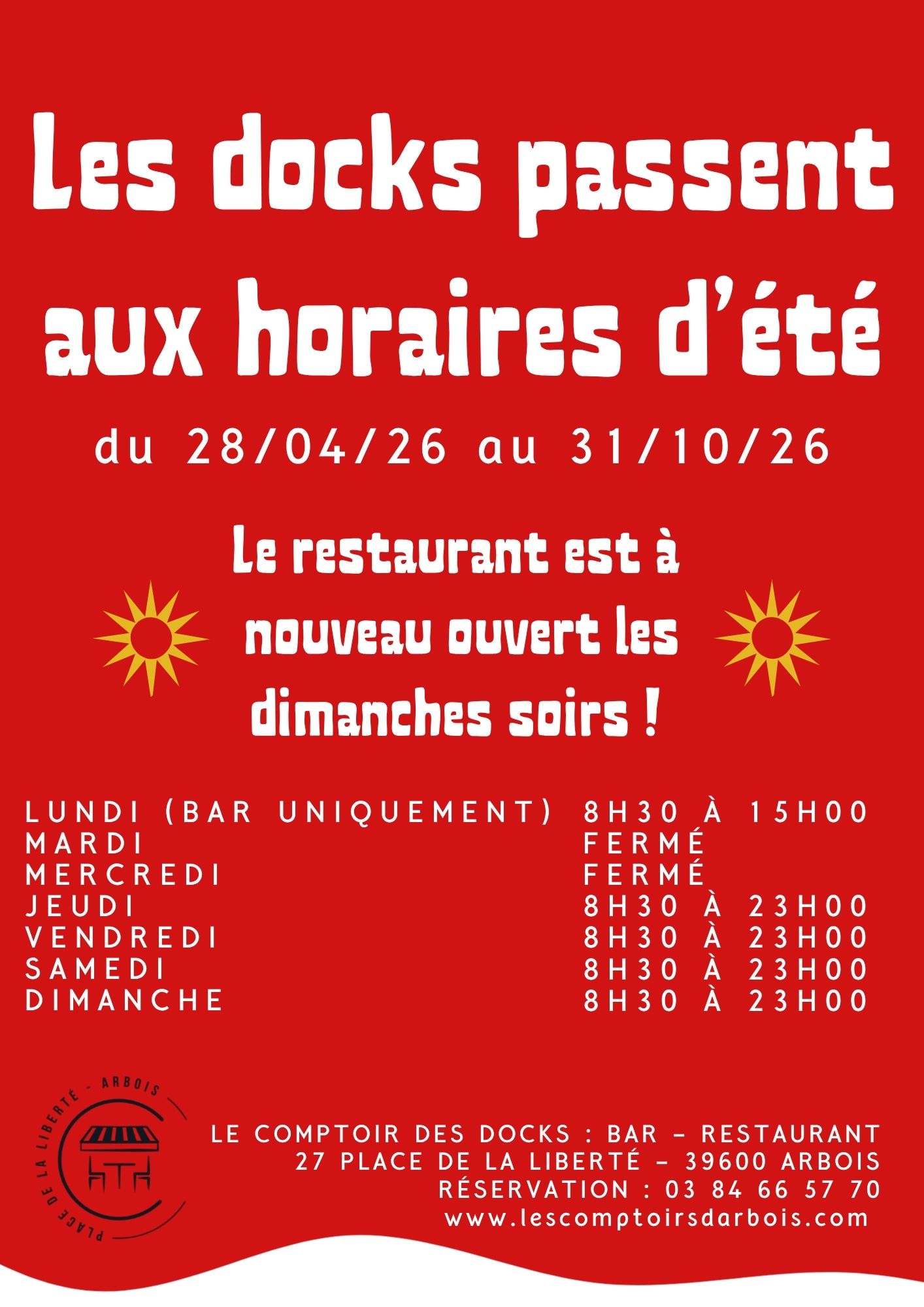 Avec l’arrivée des beaux jours, le Comptoir des Docks change de rythme dès la semaine prochaine et reprend ses horaires d’ouverture habituels, avec notamment la réouverture du restaurant le dimanche soir.